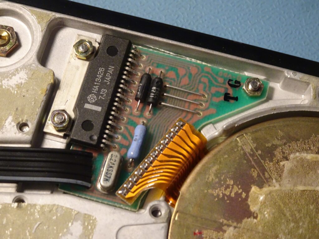 According to the datasheet, a resistor connected between pin 7 and ground determines the maximum drive current. The blue resistor on this PCB has a value of about 0.5 Ω, which results in a maximum current of 1 A. I added another 1 Ω in parallel to increase the current by 50{7a276caea3d25d5c947b30f55bc036926d9bb3bf2c591b4970136129db74dbdf}. I also turned up the voltage to 13.5 V. This finally convinced the motor to start spinning. Most likely the bearing had seized up after sitting still for about three decades. Apparently, it’s also possible to clean and lubricate the bearings, but this requires a complete disassembly of the platters and heads, which is a very risky operation.