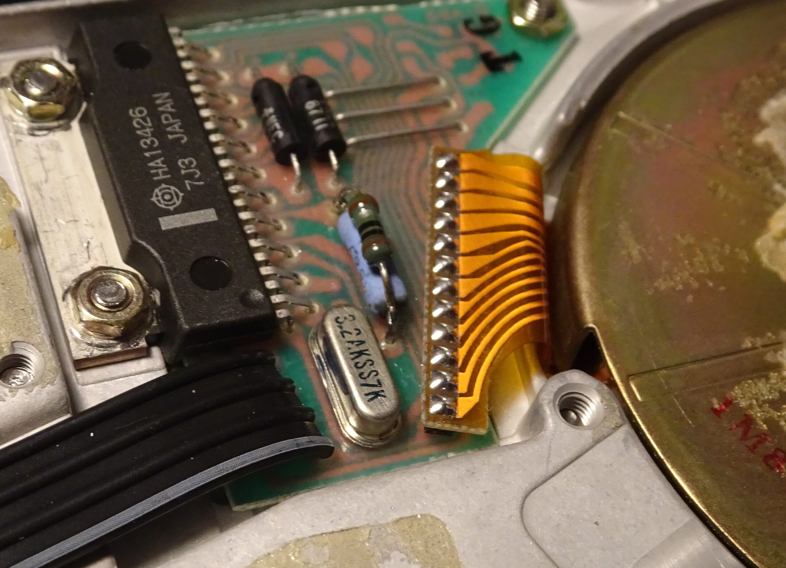 The PCB holds a Hitachi HA13426, which is a motor driver specifically designed for three-phase brushless hard drive motors. It has outputs for driving three coils and inputs for Hall sensors, which allow it to very accurately control the motor’s speed.
