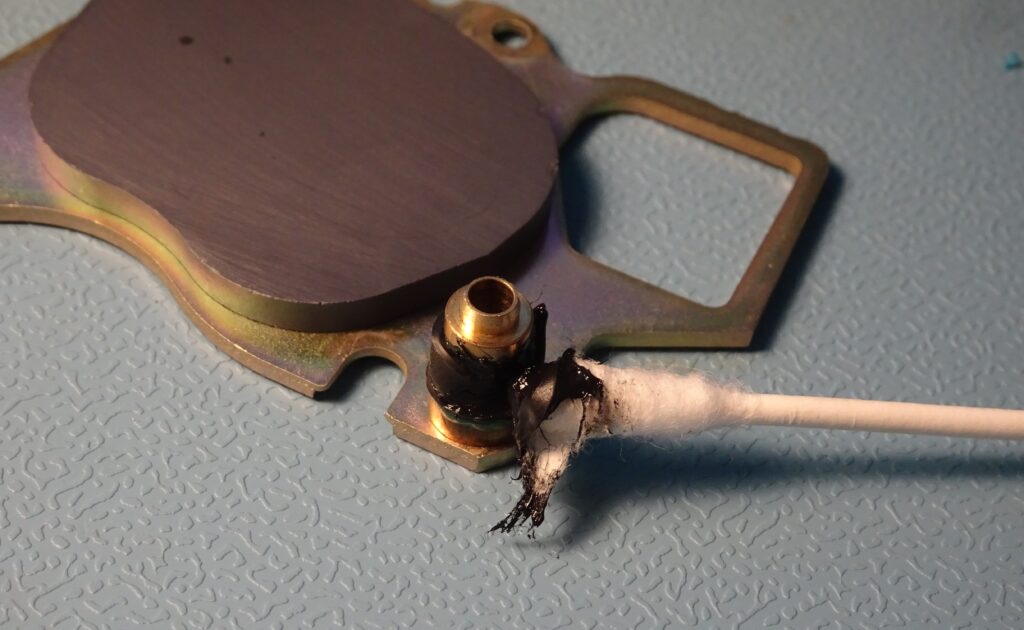 The rubber has disintegrated so far that it’s really not solid anymore: I can actually wipe it off using a cotton bud. The goo dissolves very well in acetone, so I used that to clean off the last remnants.