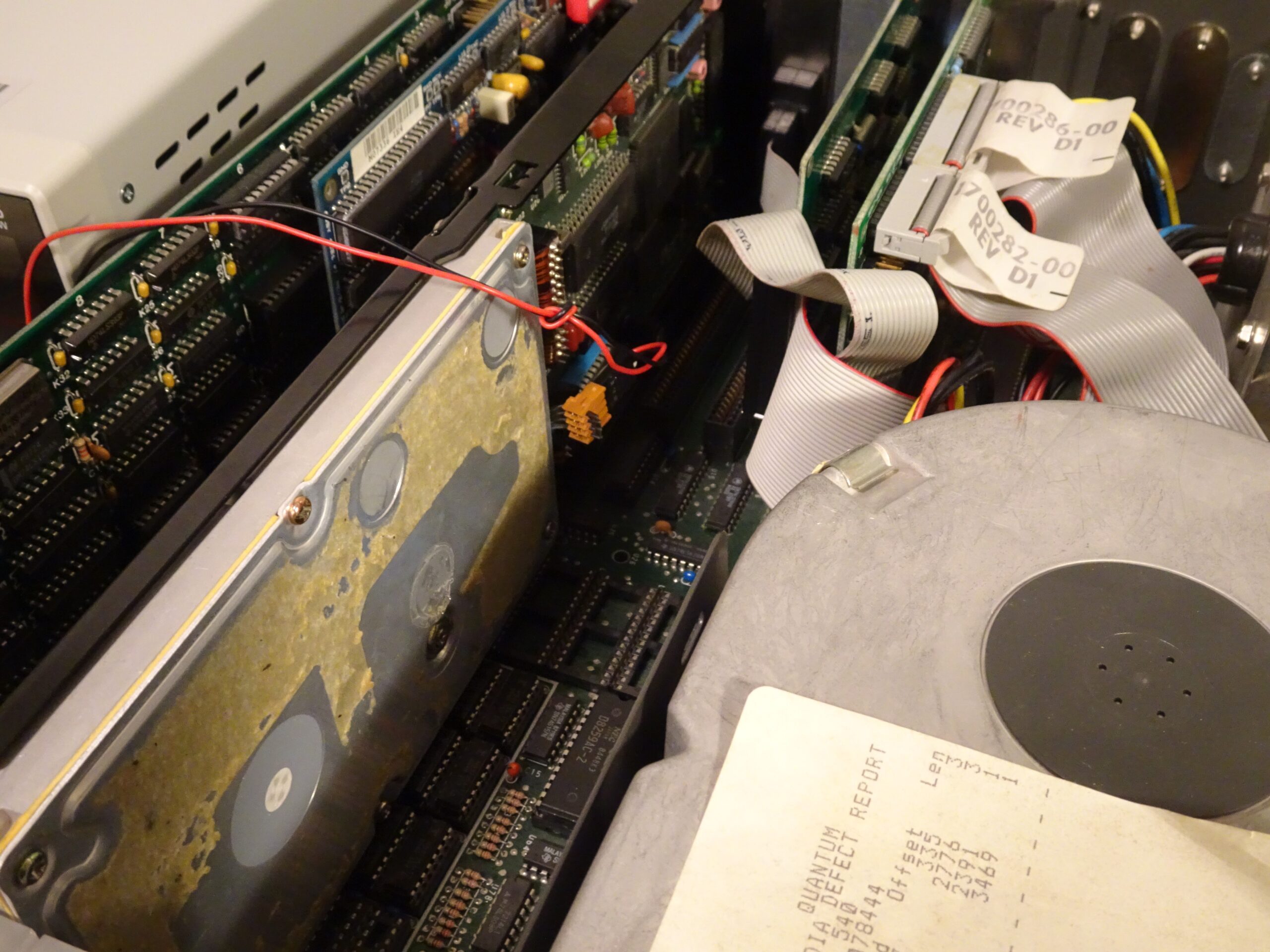 This one, made in 1987, had been sitting in my junk box for years. I found it somewhere years ago, tried it, couldn’t get it to work, and forgot about it. Today however, I’ll try to get it to running again and find out if there’s still any data inside. Its total capacity is 20 MB, and it connects to a PC through an 8-bit ISA bus.