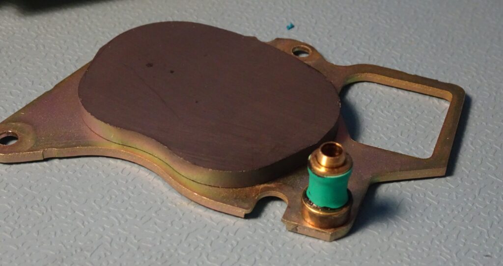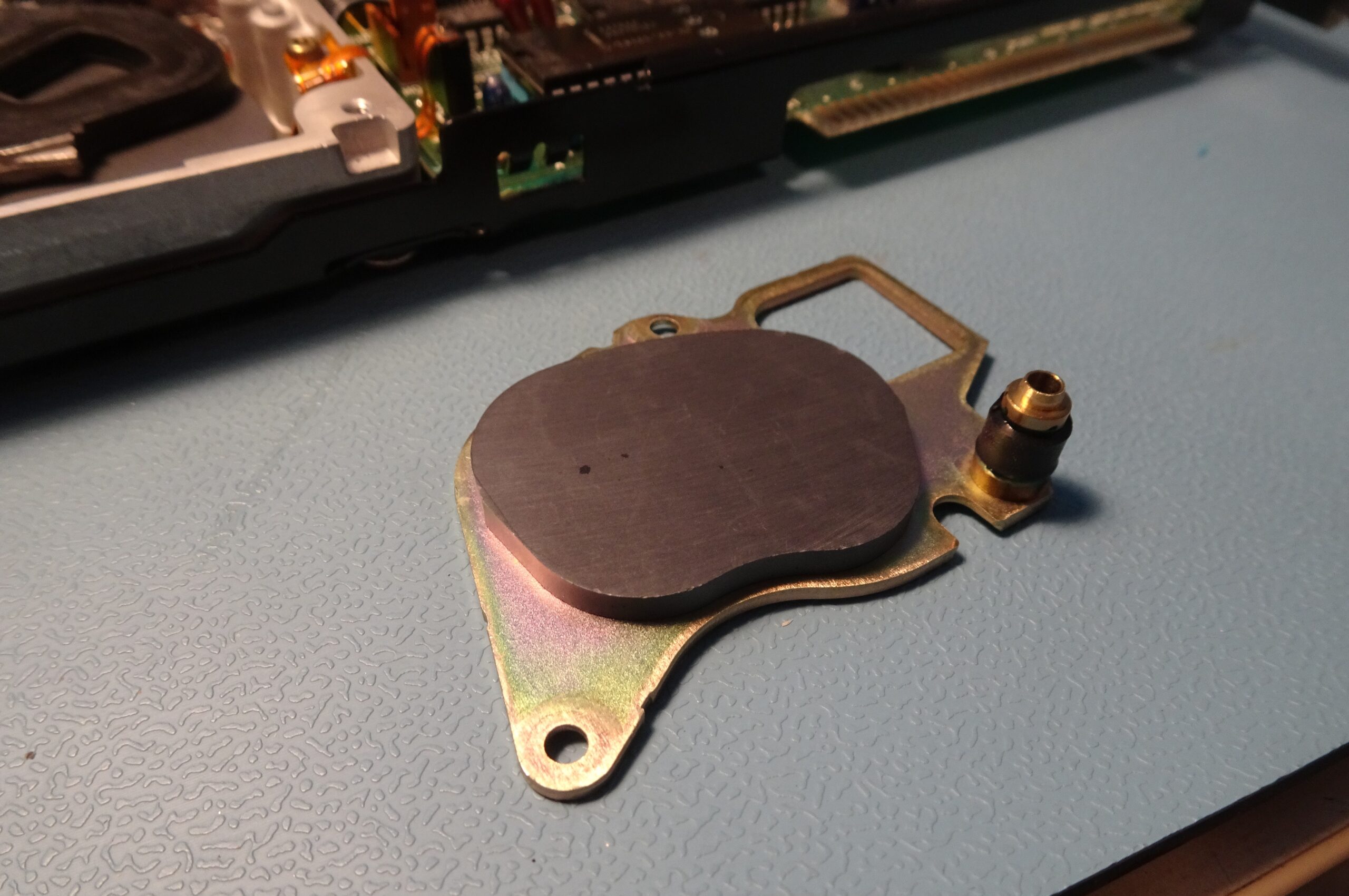 If we remove the top magnet (exposing the voice coil, encased in black plastic, in the top left of the image), we can already spot some trouble. The black cylinder on the right edge of the magnet is a bump stop which marks the limits of movement of the head assembly. It’s made of a type of rubber that disintegrates over time and turns into a gooey mess to which the head assembly sticks. This is a very common failure mode for Quantum hard drives of this era.