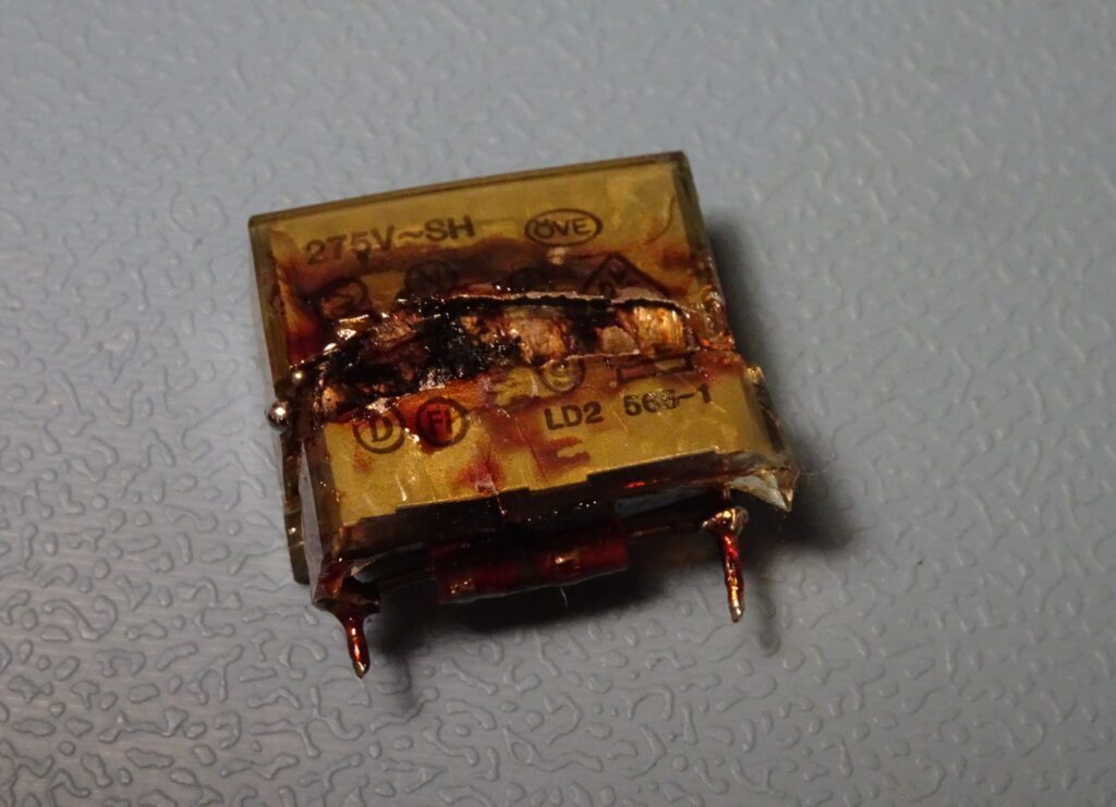 This is what a Rifa PMZ2050MC, a 220 nF X2 capacitor, looks like after it’s let out the magic smoke. This one also had a 1.2 MΩ bleeder resistor connected in parallel. These old Rifas are notorious for randomly blowing up, so you might want to replace any you find in old gear as a precaution.