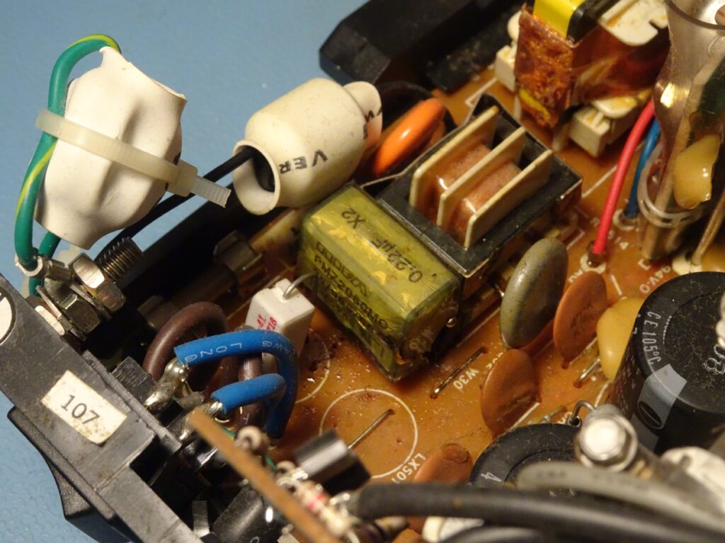 Another interesting thing that happened during this project was that an EMI suppression capacitor in the XT’s monitor failed. I noticed this when I returned to my lab after a few hours, having accidentally left the monitor plugged in and turned on. This shouldn’t normally be a problem, but older power supplies sometimes have X2 capacitors like this one that can suddenly fail. At least it failed gracefully without catching fire, as safety capacitors are supposed to do, so in that sense it performed well. Unfortunately, the liquid it releases in the process has a horrible smell and ends up everywhere on the circuit board.